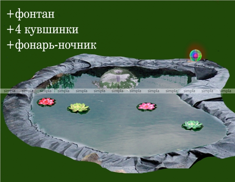 В комплекте: Подложка под пленку 20 м2 черная прудовая пленка 1мм Каучук, размером 4.4х3.0м Фонтанная фильтровальная установка мощность 16 вт с насадкамиКувшинки 2шт. Основной, классический вариант установки пруда на участке. Включает в себя три несложных этапа. 1. В выбранном месте выкапывается нужного размера приямок 2. В приямок укладывается подложка, стелится прудовая пленка и заливается водой. 3. Готовый пруд декорируется природными материалами. 4. Подключается оборудование.